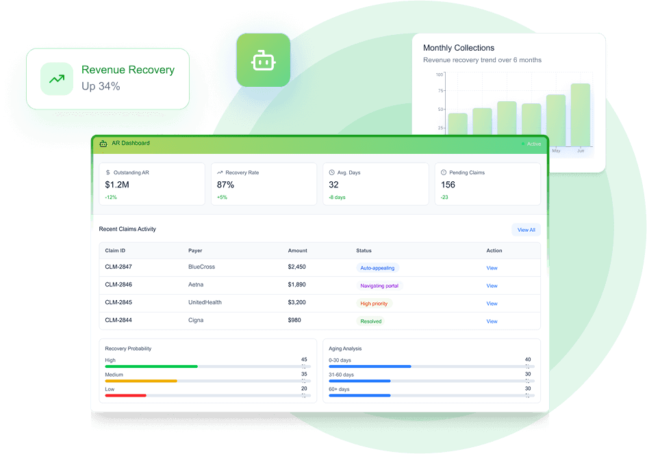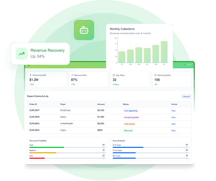 The Accounts Receivable Bot is a PMS-agnostic AR automation solution that improves follow-ups and reduces manual effort, available as a standalone web platform or integrated into existing environments.